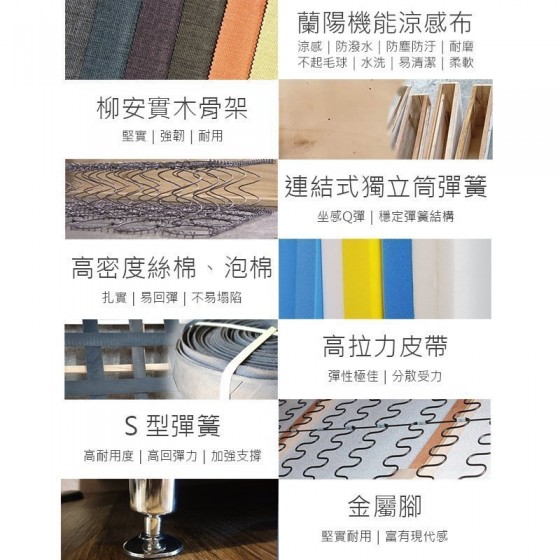 ● 涼感機能亞麻布 / 高密度泡棉 / 高彈力絲棉 / 柳安實木骨架 / 高拉力彈性皮帶 / 防塵底布 / 金屬腳 / 此款沙發布套為可全拆式