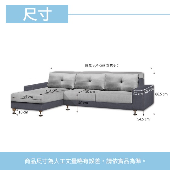 正L型(如圖):寬304*貴妃椅邊長185*高96.5 公分 / 訂購時請備註方向