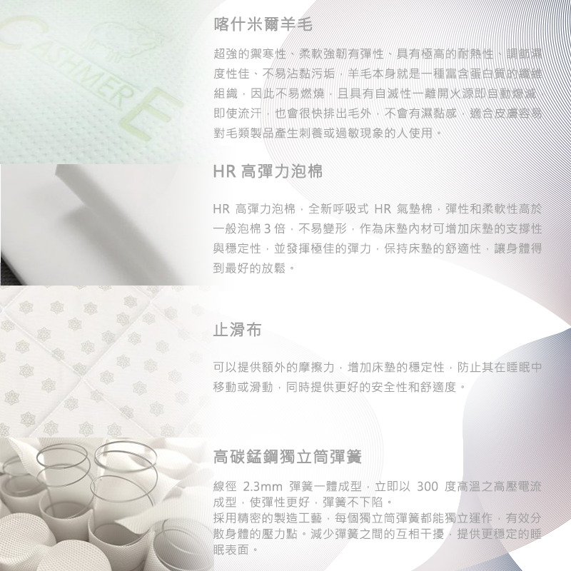 ● 商品名稱:K103-03-2 美國伊麗絲凱薩喀什米爾羊毛獨立筒床墊/另售3.5尺及6尺