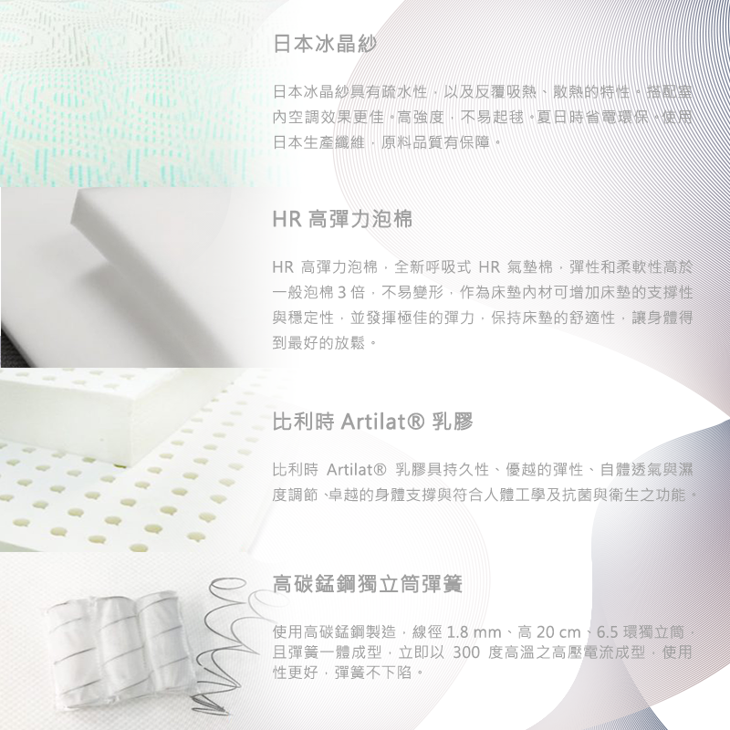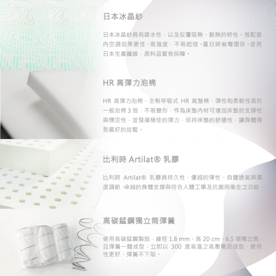 ● 比利時Artilat®乳膠:比利時Artilat®乳膠具持久性、優越的彈性、自體透氣與濕度調節、卓越的身體支撐與符合人體工學及抗菌與衛生之功能