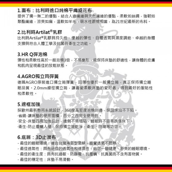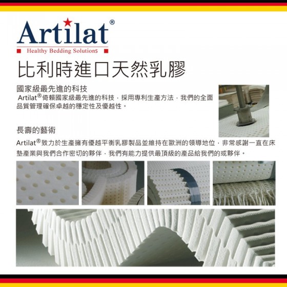 比利時Artilat®乳膠具持久性、優越的彈性、自體透氣與濕度調節、卓越的身體支撐與符合人體工學及抗菌與衛生之功能。