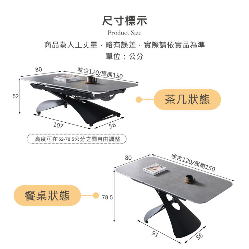 ● 尺寸約:(茶几模式)寬收合120-拉開150*深80*高52公分/(餐桌模式)寬收合120-拉開150*深80*高78.5公分